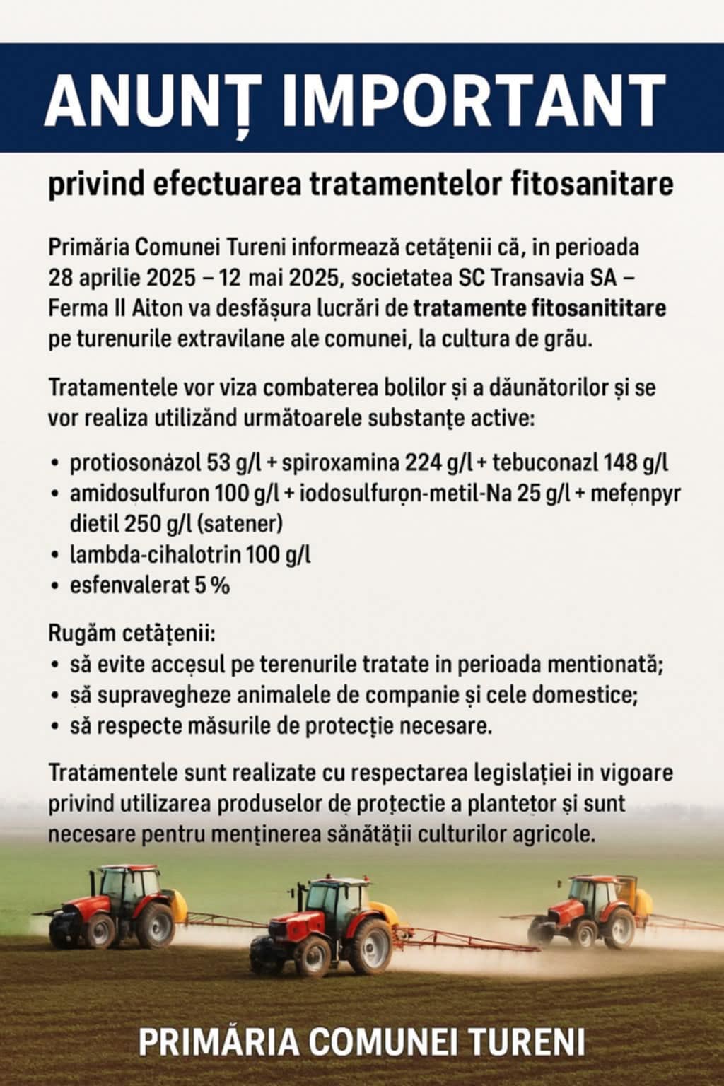 Primăria Comunei Tureni informează cetățenii că, în perioada 28 aprilie 2025 – 12 mai 2025, societatea SC Transavia SA – Ferma II Aiton va desfășura lucrări de tratamente fitosanitare pe terenurile extravilane ale comunei, la cultura de grâu.