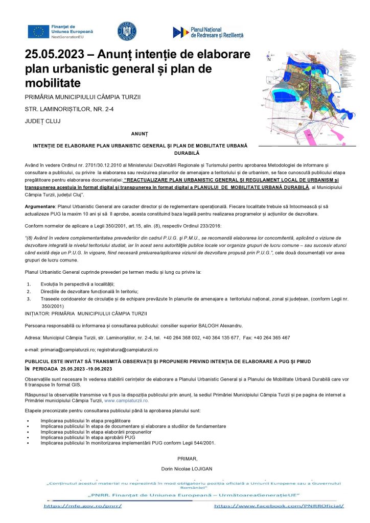 25.05.2023 – Anunț intenție de elaborare plan urbanistic general și plan de mobilitate