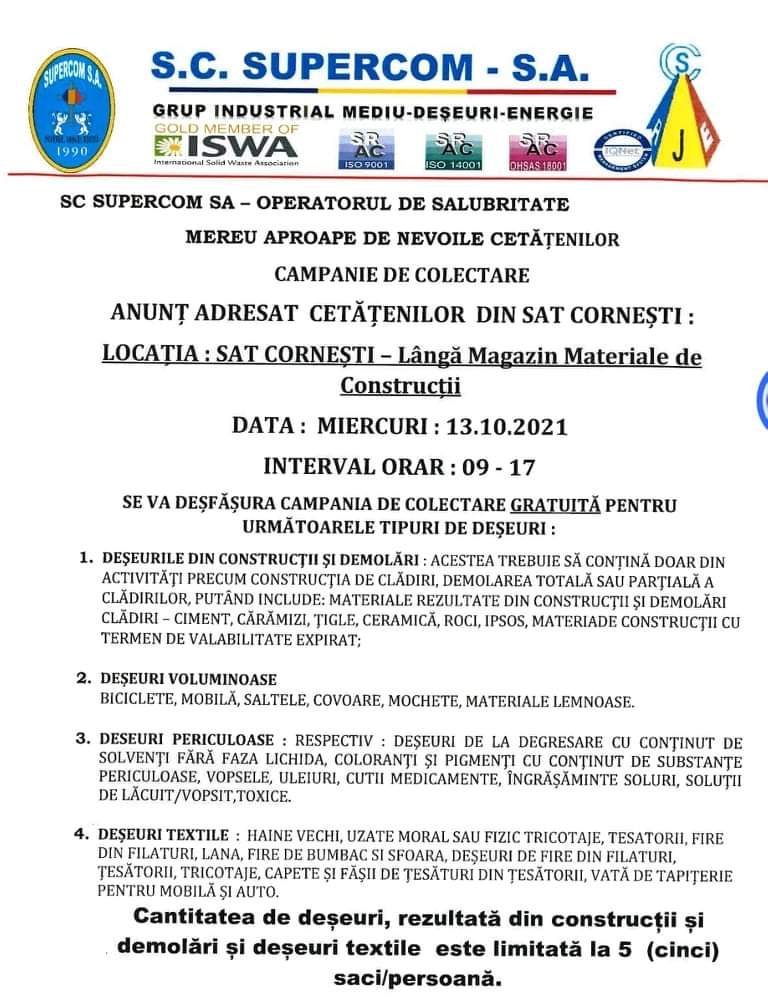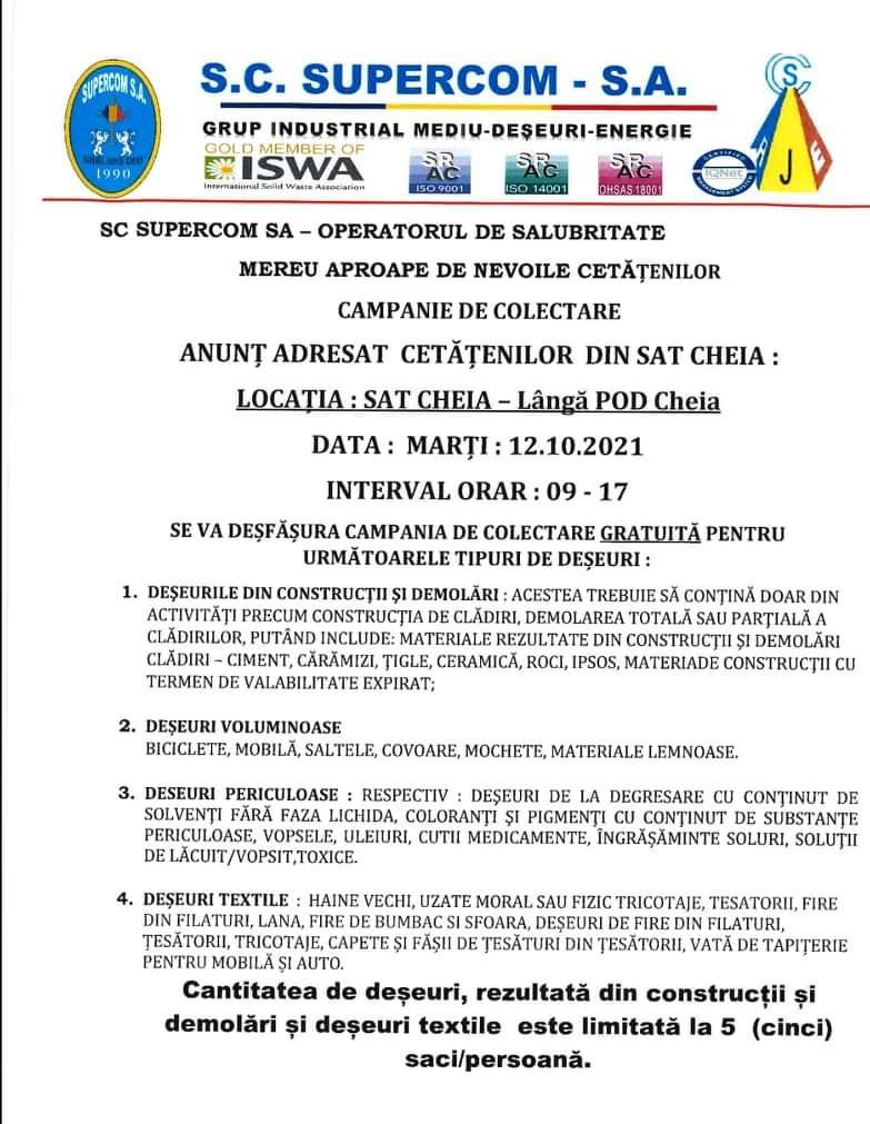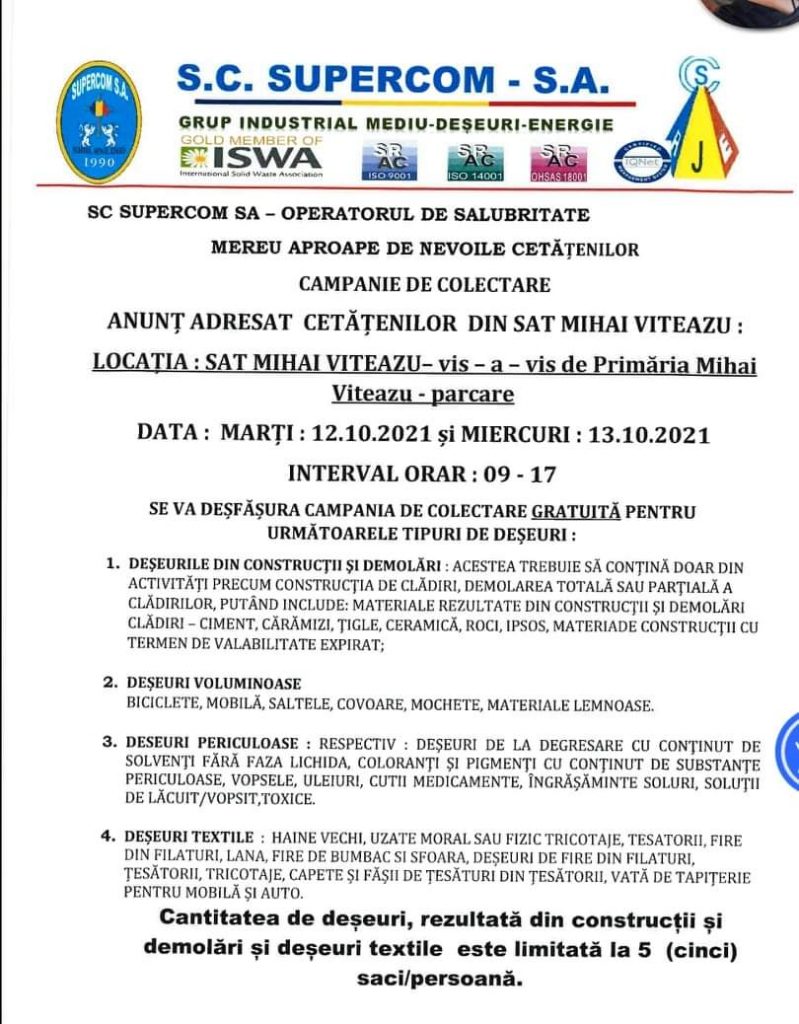 Actualitate ANUNȚ MIHAI VITEAZU ziarul21.ro 7 octombrie 2021, 18:48 Share Tweet Share Share Email Comments Anunt – campanie de colectare gratuită a deșeurilor provenite din demolari, deșeuri periculoase, deșeuri voluminoase, deșeuri textile-MARTI 12.10.2021. Related Items:Anunt – campanie de colectare gratuita a deseurilor provenite din demolari, deseuri periculoase, deseuri textile-MARTI 12.10.2021, deseuri voluminoase, Featured, ziarul 21 Share Tweet Share Share Email Recommended for you Noii polițiști ai IPJ Cluj, instruiți în comunicarea cu cetățenii: profesionalismul începe cu dialogul BĂRBAT URMĂRIT NAȚIONAL DEPISTAT DE POLIȚIȘTI ÎN CLUJ Se începe sterilizarea și microciparea câinilor din comuna Mihai Viteazu Click to comment Leave a Reply Anulează răspunsulComentariile trebuie să respecte regulile de utilizare.Adresa ta de email nu va fi publicată. Câmpurile necesare sunt marcate cu *Comentariu * Nume * Email * Δ Acest site folosește Akismet pentru a reduce spamul. Află cum sunt procesate datele comentariilor tale.