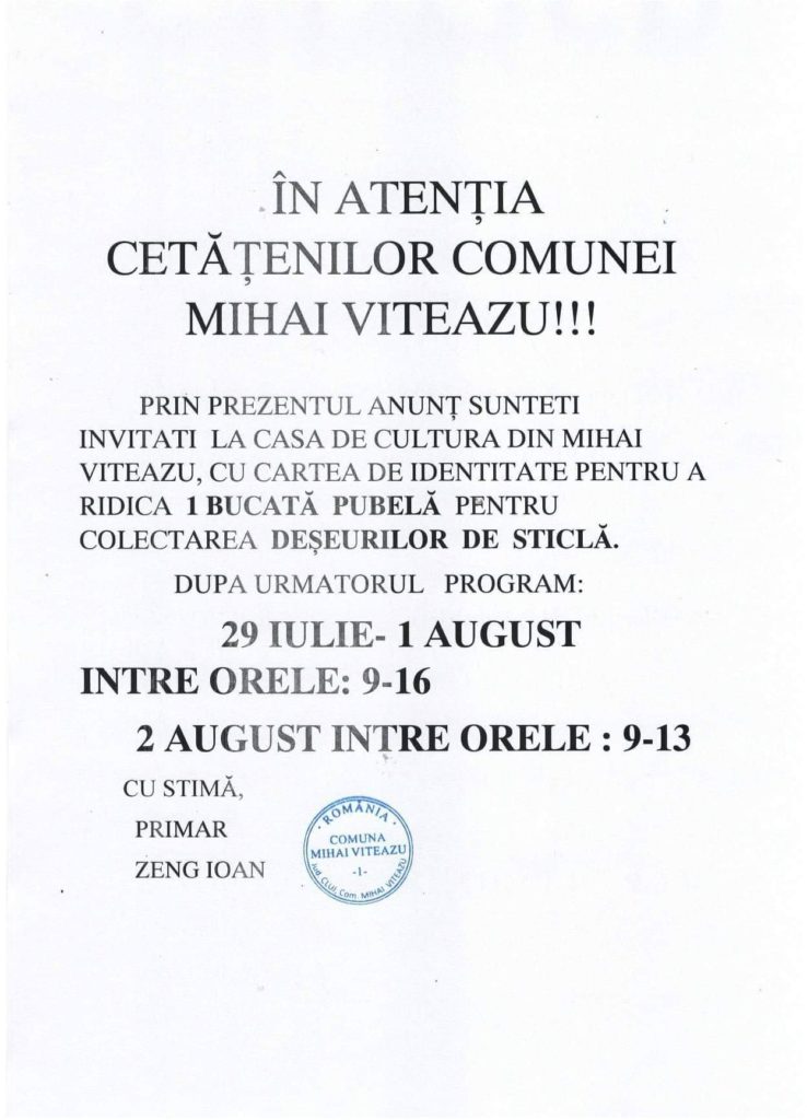 Prin prezența anunțului sunteți invitați la Casa de Cultură din Mihai Viteazu, cu cartea de identitate pentru a ridica 1 bucata pubela pentru colectarea deșeurilor de sticlă