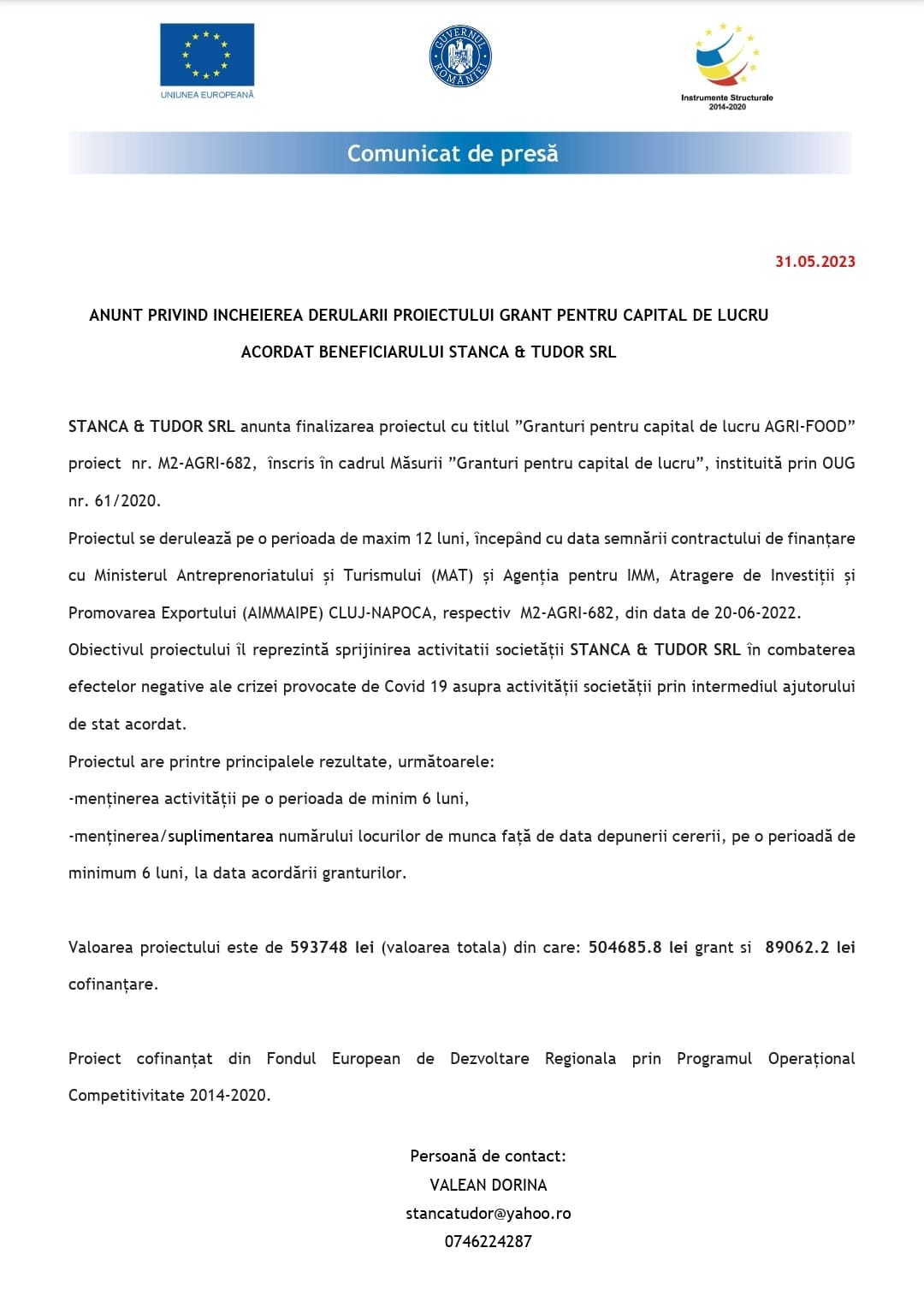 ANUNT PRIVIND INCHEIEREA DERULARII PROIECTULUI GRANT PENTRU CAPITAL DE LUCRU ACORDAT BENEFICIARULUI STANCA & TUDOR SRL