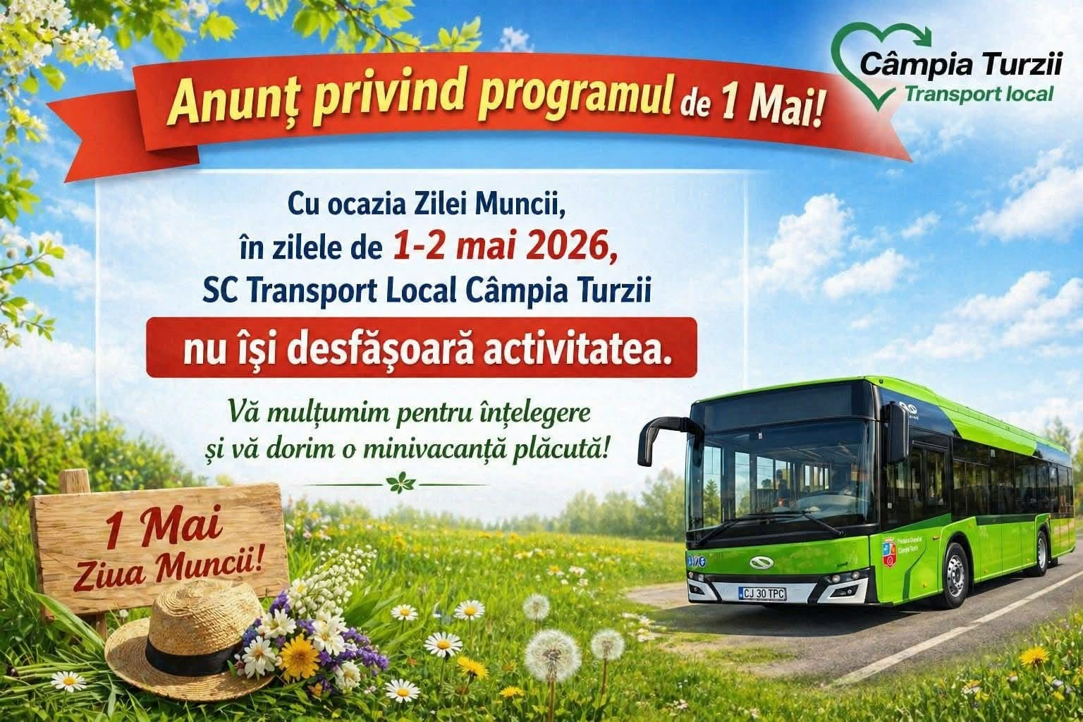Actualitate Anunț privind programul de 1 Mai ziarul21.ro astazi, 16:01 Share Tweet Share Share Email Comments Cu ocazia Zilei Muncii, în zilele de 1–2 mai 2026, SC Transport Local Câmpia Turzii nu își desfășoară activitatea. Vă mulțumim pentru înțelegere și vă dorim o minivacanță plăcută! Related Items:Anunț privind programul de 1 Mai, campia turzii, Featured, turda, ziarul 21 Share Tweet Share Share Email Recommended for you „D-ale carnavalului” la TNAMT Foto. De vânzare apartament cu 2 camere complet mobilat și utilat, în Turda Bărbat reținut și arestat preventiv pentru încălcarea ordinului de protecție, la Turda Click to comment Leave a Reply Anulează răspunsulComentariile trebuie să respecte regulile de utilizare.Adresa ta de email nu va fi publicată. Câmpurile necesare sunt marcate cu *Comentariu * Nume * Email * Δ Acest site folosește Akismet pentru a reduce spamul. Află cum sunt procesate datele comentariilor tale.