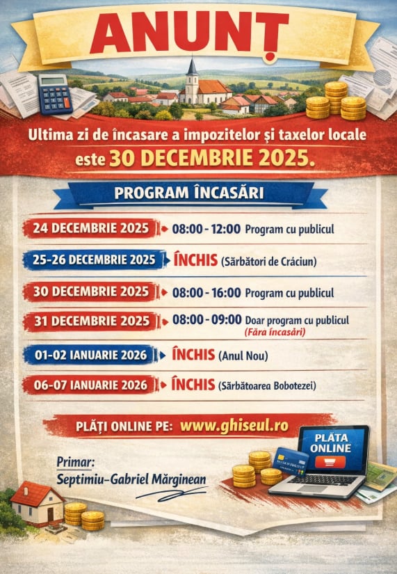 Având în vedere operațiunile de închidere a anului fiscal, UAT Comuna Tritenii de Jos vă aduce la cunoștință că ultima zi de încasare a impozitelor și taxelor locale este 30 decembrie 2025.