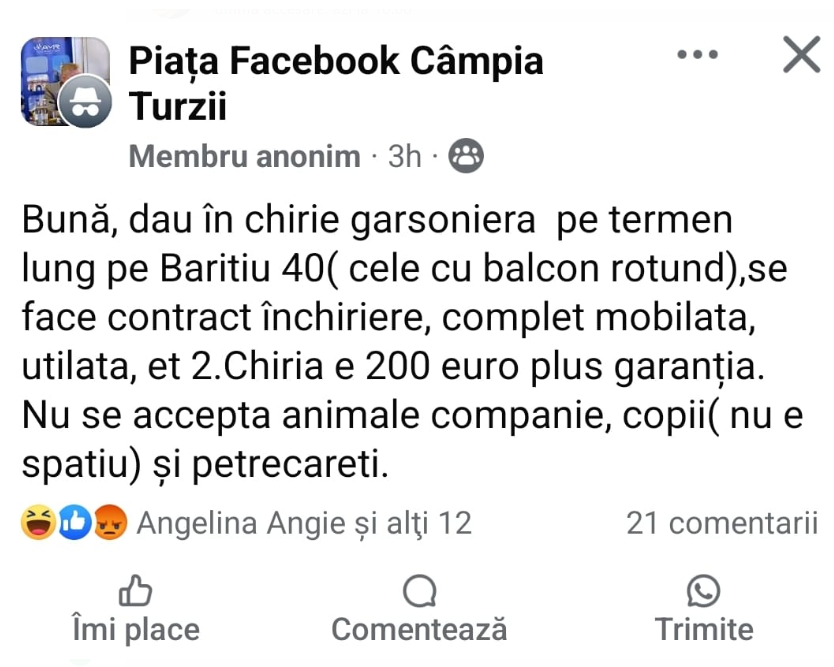 Pe unul dintre grupurile de facebook din Câmpia Turzii a apărut un anunț de închiriere care a născut multă revoltă. Nu vorbim de pretul de închiriere pentru că prețul corect întotdeauna îl dă piața ci de faptul că în anunț era o condiție:”nu se acceptă animale de companie și copii”