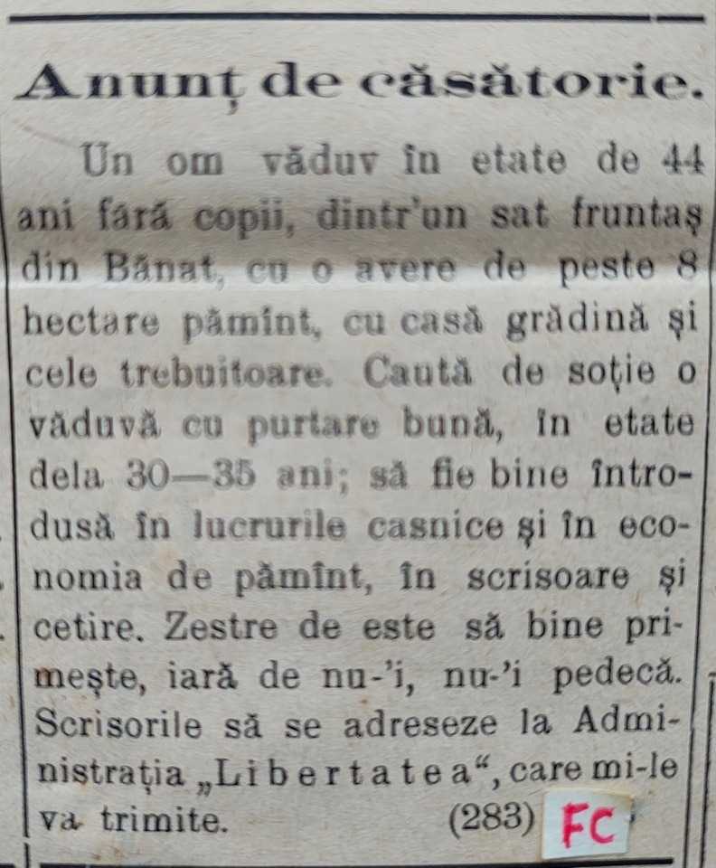 Un văduv de 44 de ani, fără copii, dintr-un sat fruntaș din Banat, își căuta soție printr-un anunț publicat într-un ziar. Poseda peste 8 hectare de pământ, o casă, o grădină și toate cele necesare traiului, dar îi lipsea o tovarășă de viață.