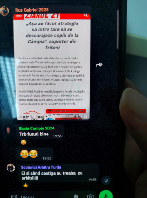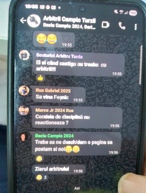 Pe adresa redacției au ajuns discuții uluitoare din interiorul grupului de WhatsApp al arbitrilor din zona Câmpia Turzii, în care se face referire la echipa din Câmpia Turzii cu expresii șocante, de o violență verbală greu de imaginat pentru cei care ar trebui să fie garanții corectitudinii pe teren.
