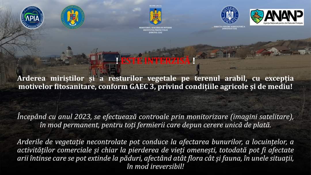Instituția Prefectului – Județul Cluj atrage atenția cetățenilor asupra pericolelor generate de arderile necontrolate de vegetație.