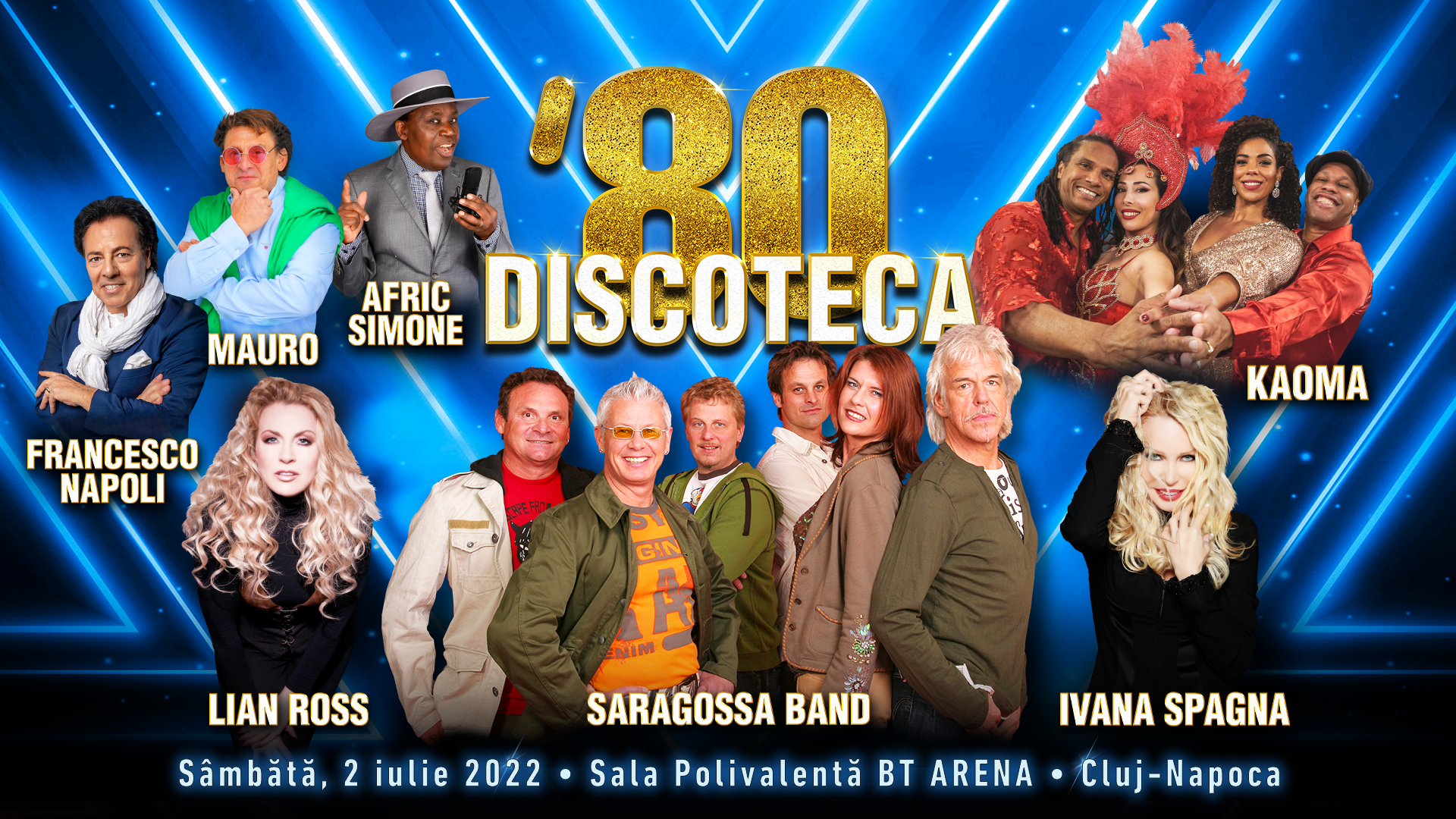 SARAGOSSA BAND, LIAN ROSS, IVANA SPAGNA, AFRIC SIMONE, KAOMA, MAURO și FRANCESCO NAPOLI, idoli ai muzicii anilor ’80, vor concerta live în 2 iulie 2022, de la ora 19:00, la Sala Polivalentă BT Arena din Cluj-Napoca, în cadrul evenimentului Discoteca ’80. Show-ul de peste 5 ore este organizat de Backstage Production, iar biletele cu prețuri promoționale începând de la 119 lei vor fi puse în vânzare în data de 15 decembrie, ora 11.