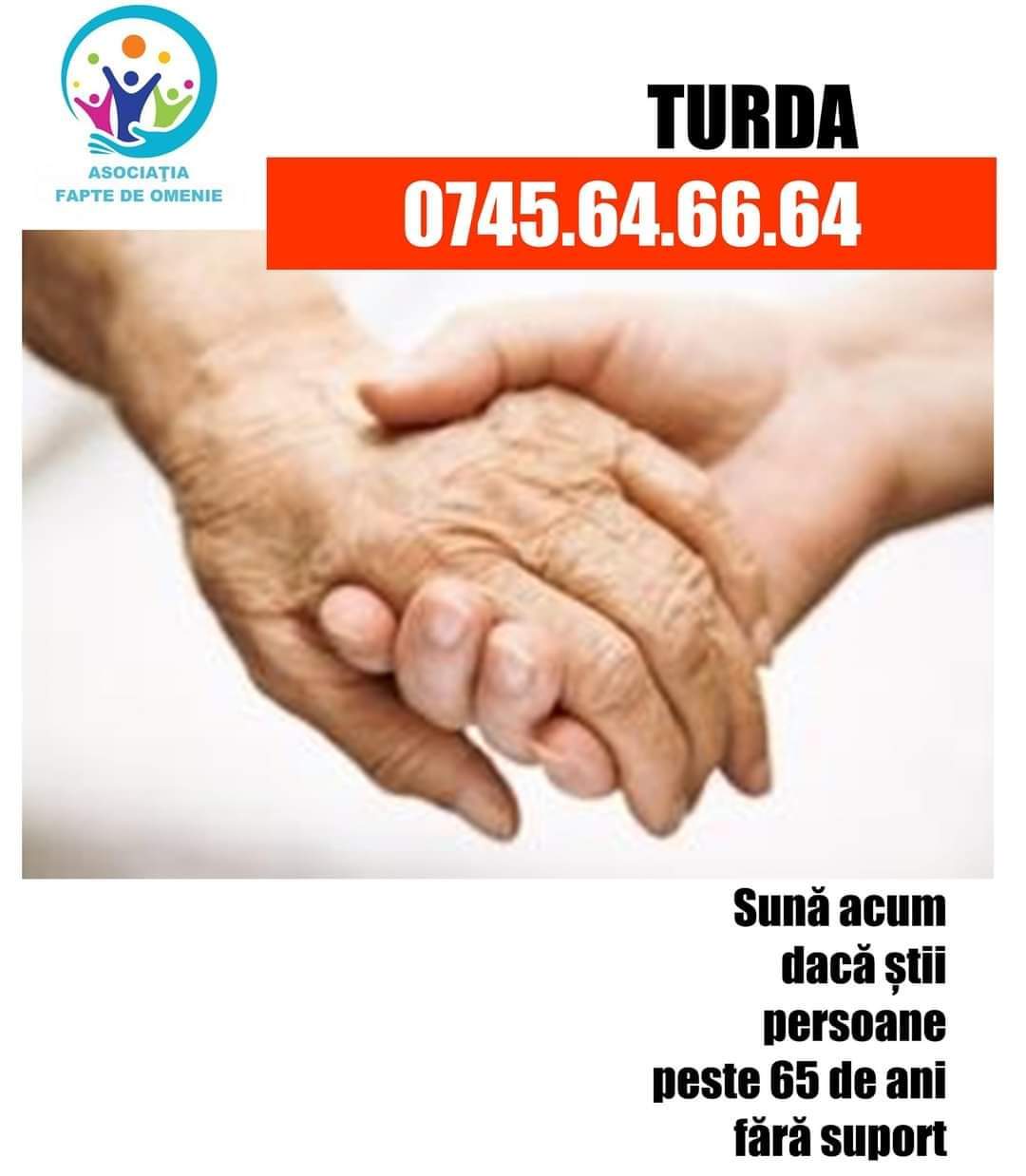 Dacă știți persoane care au peste 65 de ani și au nevoie de ajutor ca să nu fie nevoite să iasă din casă, puteți suna la numărul de telefon: 0745.64.66.64. Pot suna persoanele fără susținători, dar și cei care cunosc turdeni care au peste 65 de ani și au nevoie de ajutor să-și procure alimente, medicamente sau produse de igienă.