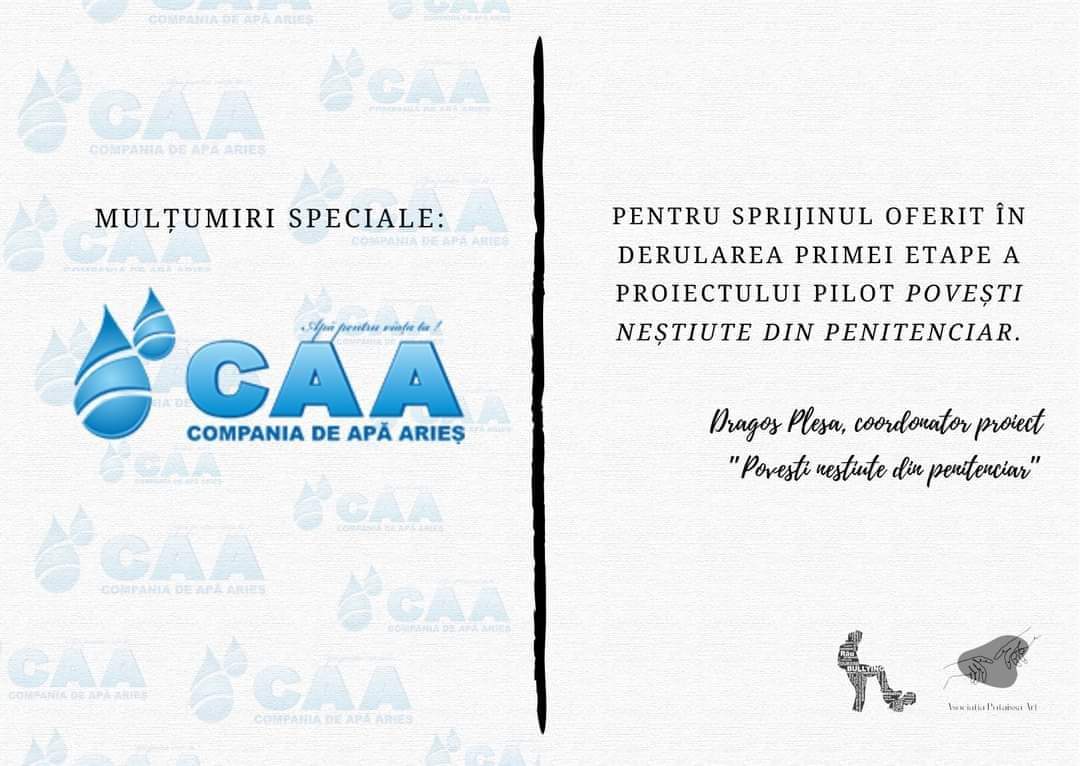 Dorim să le mulțumim celor de la Compania de Apa Aries pentru sprijinul pe care ni-l oferă în ceea ce privește realizarea primei etape a proiectului ”Povești neștiute din penitenciar”. Ne bucurăm că sunteți alături de noi, mai ales atunci când vine vorba de oameni și emoțiile lor!