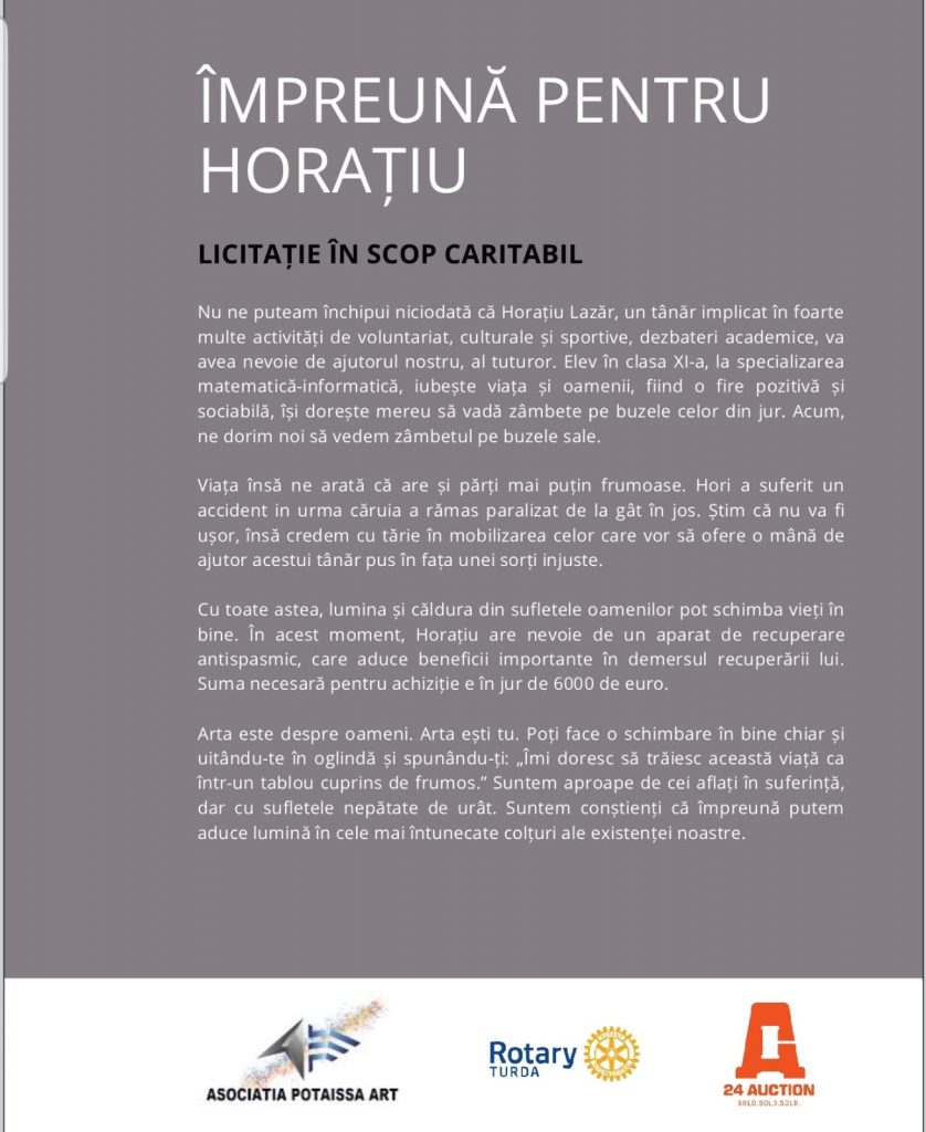 Asociaţia Potaissa Art mulţumeşte partenerilor săi şi donatorilor care s-au implicat în perioada 19 noiembrie-2 decembrie 2020 la expoziţia şi licitaţia în scop caritabil ARTA ESTE DESPRE OAMENI- ÎMPREUNĂ PENTRU HORAŢIU! Evenimentul a fost iniţiat de Asociaţia Potaissa Art pentru a-l ajuta pe elevul Horaţiu Lazăr care a suferit un accident în urma căruia a rămas paralizat de la brâu în jos să achiziţioneze un aparat de recuperare antispasmic care să îl ajute la recuperarea sa.