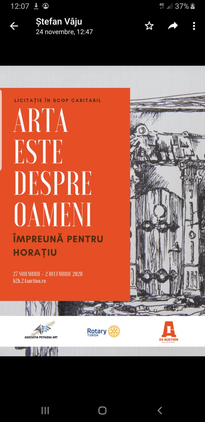 Asociaţia Potaissa Art mulţumeşte partenerilor săi şi donatorilor care s-au implicat în perioada 19 noiembrie-2 decembrie 2020 la expoziţia şi licitaţia în scop caritabil ARTA ESTE DESPRE OAMENI- ÎMPREUNĂ PENTRU HORAŢIU! Evenimentul a fost iniţiat de Asociaţia Potaissa Art pentru a-l ajuta pe elevul Horaţiu Lazăr care a suferit un accident în urma căruia a rămas paralizat de la brâu în jos să achiziţioneze un aparat de recuperare antispasmic care să îl ajute la recuperarea sa.