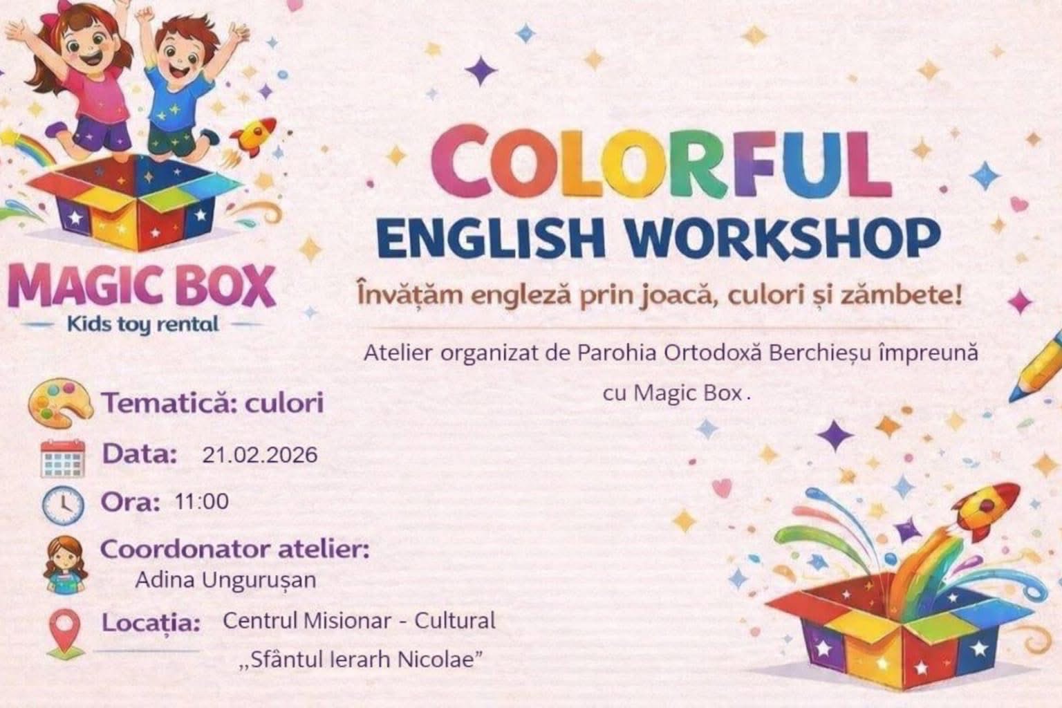 Parohia Ortodoxă Berchieșu, în colaborare cu Magic Box, organizează sâmbătă, 21 februarie 2026, un atelier special de limba engleză dedicat copiilor, intitulat „Colorful English Workshop”.