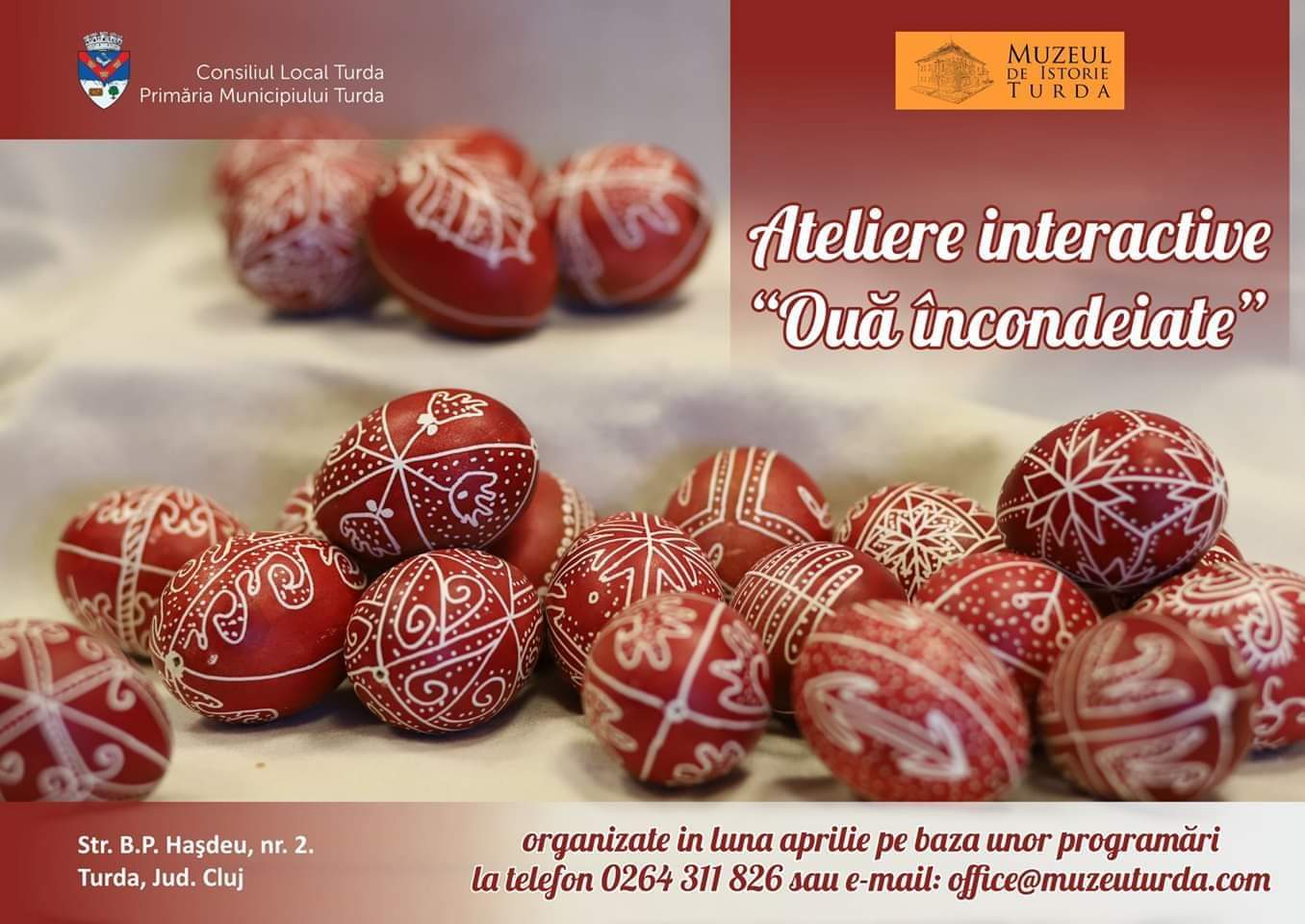 Având locuri limitate, vă rugăm confirmați participare dumneavoastră la numărul de telefon 0264-311826, persoana de contact muzeograf – Steliana Potora sau la adresa de email: office@muzeulturda.com