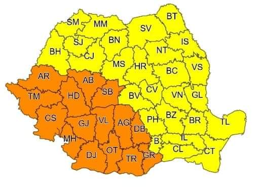 În intervalul menționat, în județele Arad, Timiș, Caraș-Severin, Hunedoara, Alba, Sibiu, Mehedinți, Gorj, Dolj, Olt, Vâlcea, Argeș, Dâmbovița, Teleorman și Giurgiu vor fi perioade, la început în sud-vest, apoi și în sud, cu intensificări puternice ale vântului (rafale de peste 80…90 km/h), vijelii, frecvente descărcări electrice, averse torențiale și grindină.