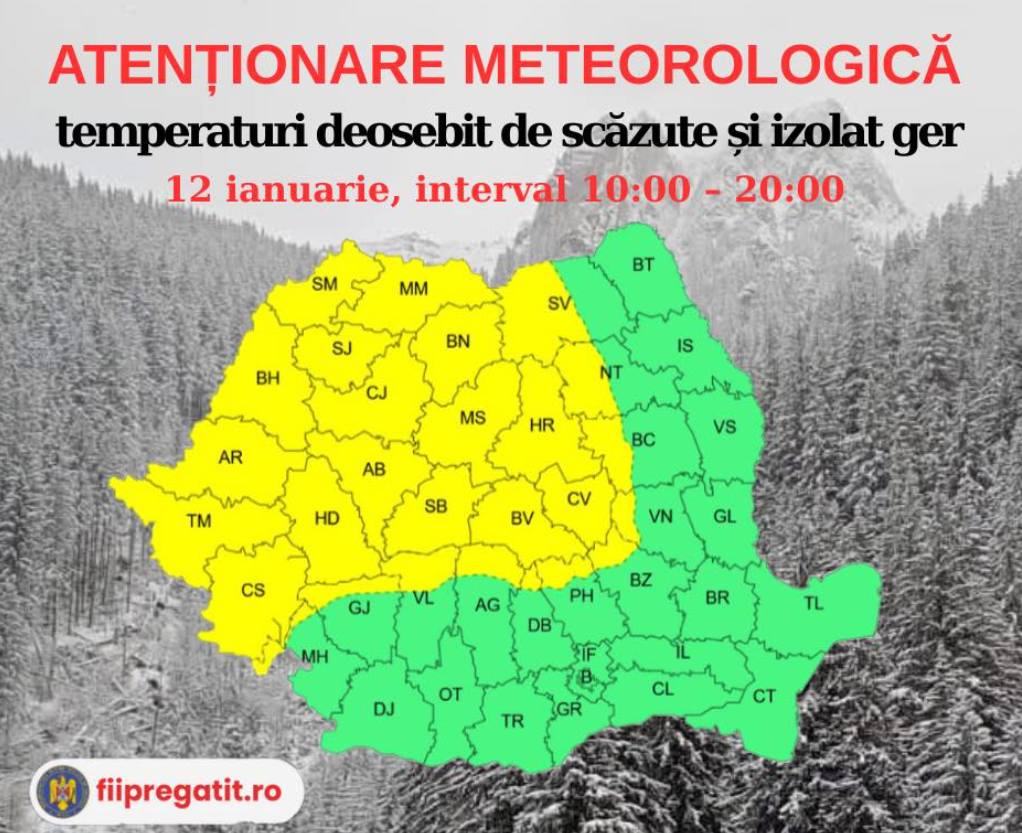 Meteorologii au emis o atenționare COD GALBEN pentru temperaturi deosebit de scăzute, valabilă în data de 12 ianuarie, intervalul orar 10:00 – 20:00, care vizează Banatul, Crișana, Maramureșul, Transilvania și zona de munte.