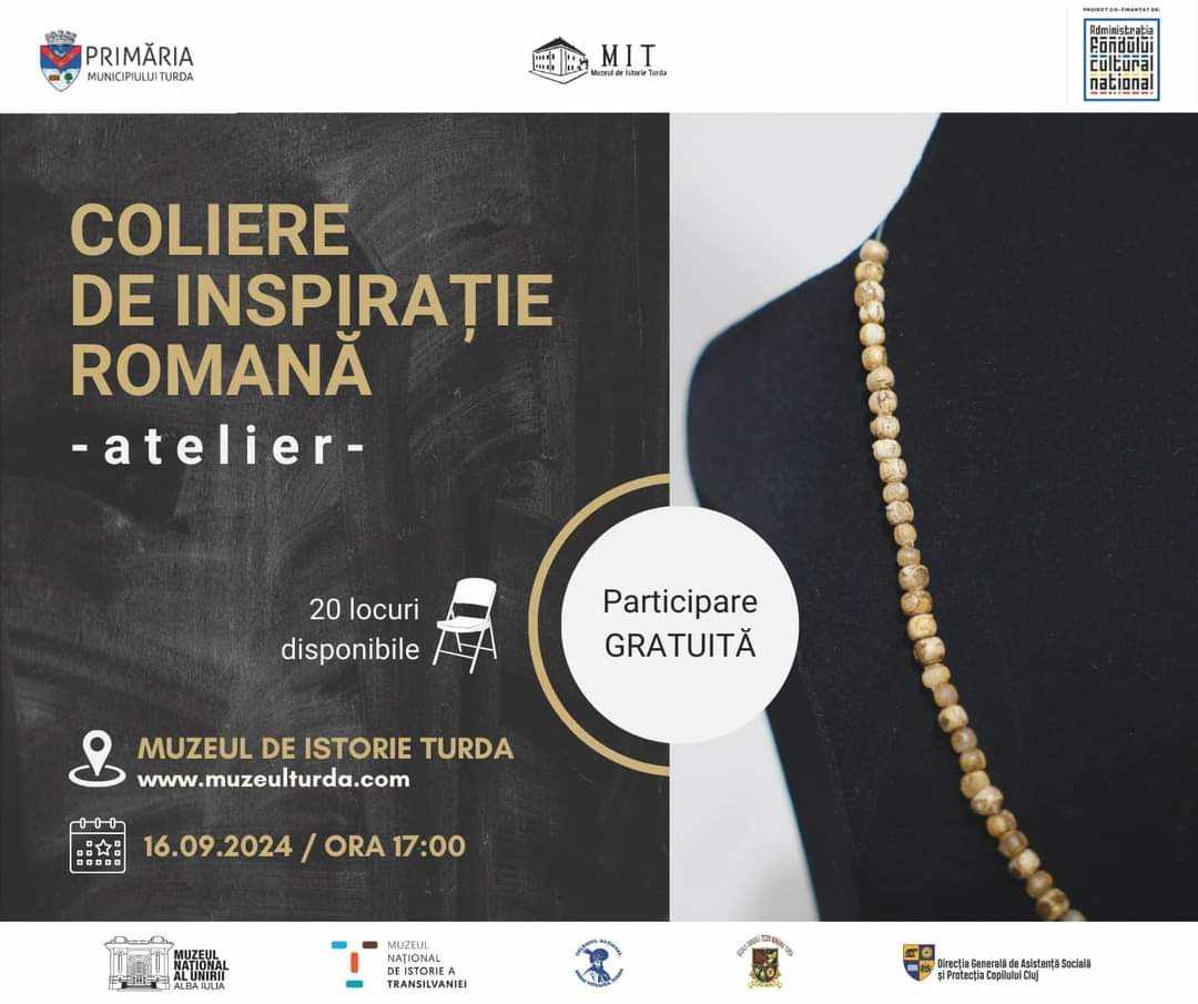 Atelierul ”Coliere de inspirație romană” va avea loc în 16 septembrie 2024, de la ora 17:00 la Muzeul de Istorie și este dedicat exclusiv adulților. În cadrul atelierului, se vor realiza replici după coliere romane atestate arheologic, iar acestea vor fi oferite ca suvenir.