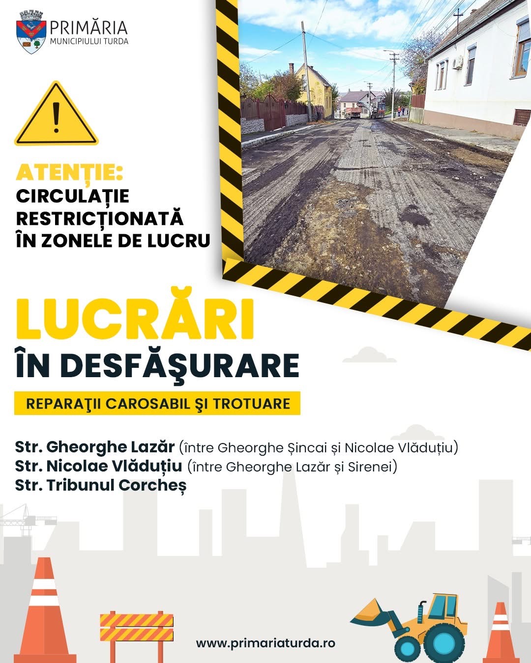 Lucrările se execută etapizat, pentru a menține traficul deschis pe durata intervențiilor. Mulțumim pentru înțelegere și recomandăm participanților la trafic să circule cu atenție în zonele în lucru.