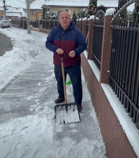 Cu lopata de zăpadă în mână, acesta a curățat trotuarul din fața casei sale, arătând că responsabilitatea nu trebuie pasată exclusiv autorităților.