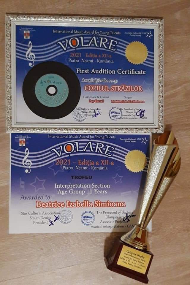 Este deja știut faptul că Dumnezeu a înzestrat-o pe Beatrice Simioana cu o voce incredibilă. Dovada vie sunt premiile câștigate pe bandă rulantă la fiecare competiție/festival la care participă. Recent a impresionat juriul de la cel mai important festival internațional pentru tinere talente- Festivalul Volare, care s-a desfășurat la Piatra Neamț, unde a câștigat doua premii importante: TROFEU la Sectiunea CREAȚIE și TROFEU de Categorie la Secțiunea INTERPRETARE.