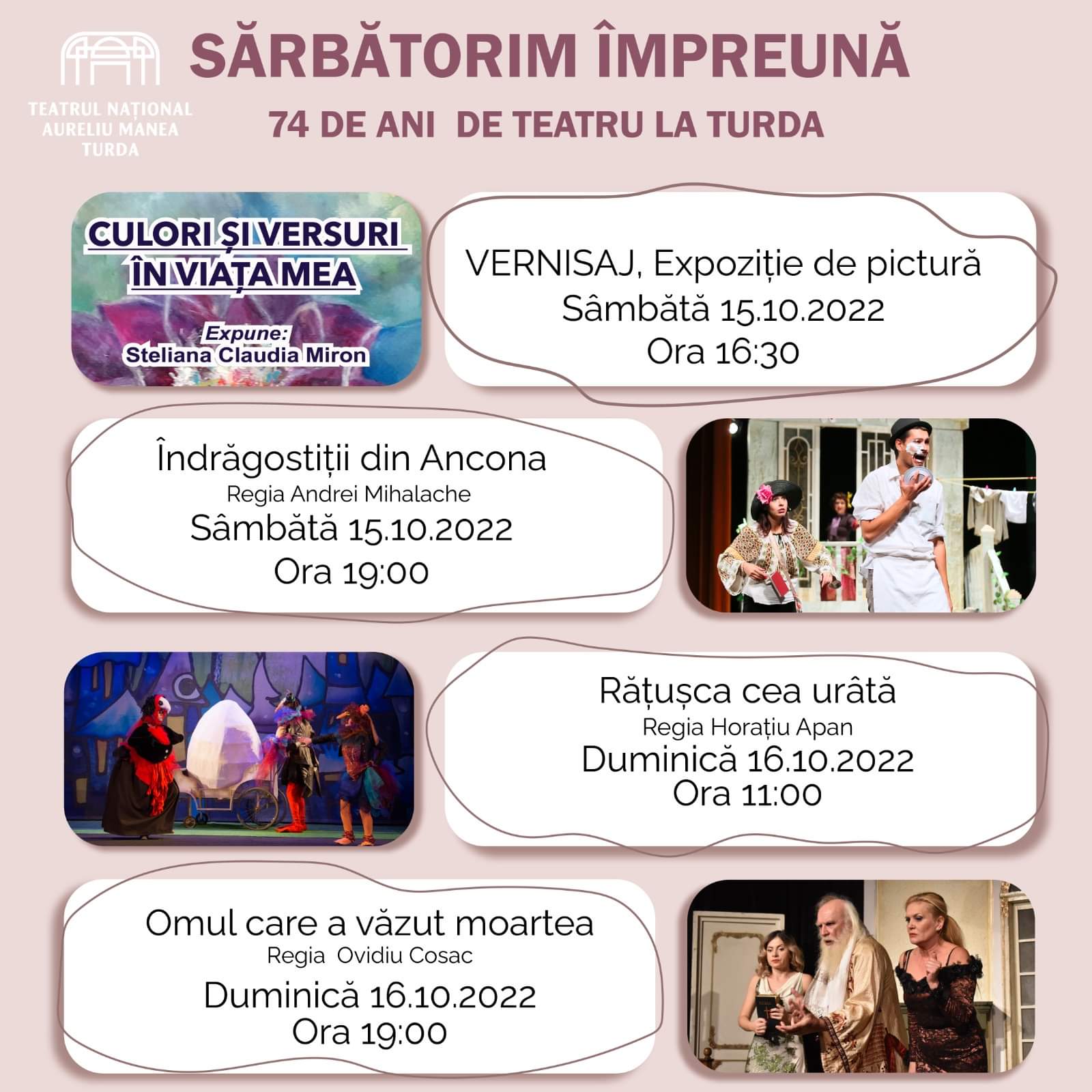 Vă așteptăm cu drag la seria de evenimente care marchează cei 74 de ani de activitate ai teatrului turdean.