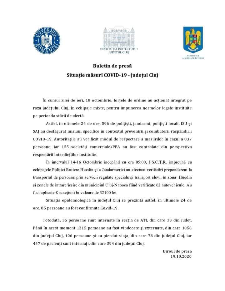 SITUAȚIE MĂSURI COVID-19 – JUDEȚUL CLUJ