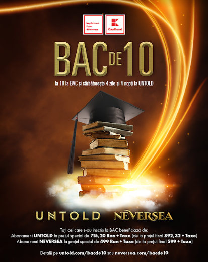 Campania “Bac de 10” continuă și în acest an! Prin această campanie, aflată deja a la cincea ediție, organizatorii UNTOLD și NEVERSEA își propun să susțină performanța în educație și să-I premieze pe cei care iau nota 10 la examenul de bacalaureat. În acest an, cine ia nota 10 la examenul maturității, va primi un abonament gratuit pentru patru zile la ediția aniversară a festivalului UNTOLD.
