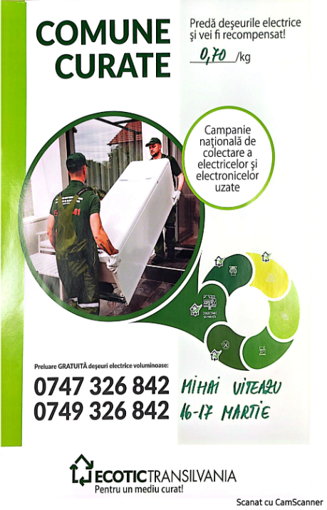 În cadrul campaniei „Comune Curate”, organizată în colaborare cu ECOTIC Transilvania, cetățenii pot preda deșeuri electrice, electronice și electrocasnice (DEEE). Ridicarea acestora se va face gratuit, direct de la domiciliu, prin programare telefonică la numerele 0747 326 842 sau 0749 326 842.
