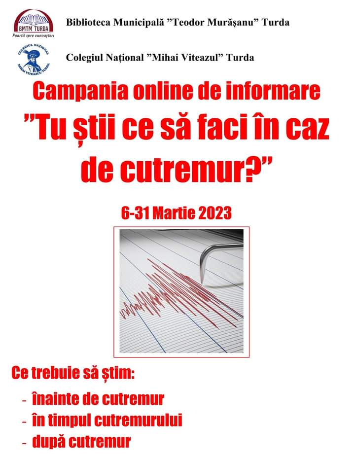 În perioada 6- 31 Martie 2023 Biblioteca Municipală ”Teodor Murășanu” Turda în colaborare cu Colegiul Național ”Mihai Viteazul” Turda organizează pentru comunitatea turdeană și împrejurimi Campania de informare ”Tu știi ce să faci în caz de cutremur?”.