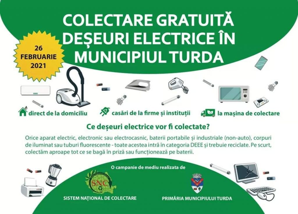 Primăria Municipiului Turda împreună cu Societatea Locală de Colectare – SLC Centru pune la dispoziția cetățenilor un serviciu GRATUIT de colectare de la domiciliu sau de la sediul instituțiilor/firmelor a deșeurilor electrice, electronice și electrocasnice, în baza unei programări prealabile stabilite de comun acord, apelând nr. de telefon 0756.026.917. Serviciul se adresează atât gospodăriilor individuale cât și instituțiilor, firmelor private.