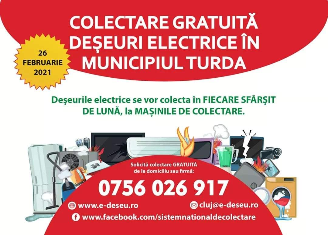 Primăria Municipiului Turda împreună cu Societatea Locală de Colectare – SLC Centru pune la dispoziția cetățenilor un serviciu GRATUIT de colectare de la domiciliu sau de la sediul instituțiilor/firmelor a deșeurilor electrice, electronice și electrocasnice, în baza unei programări prealabile stabilite de comun acord, apelând nr. de telefon 0756.026.917. Serviciul se adresează atât gospodăriilor individuale cât și instituțiilor, firmelor private.