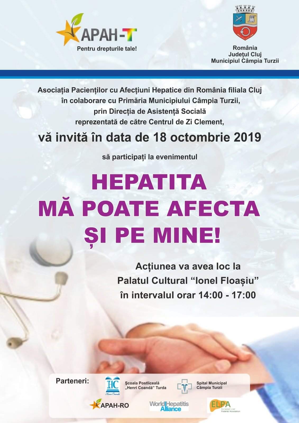 Vineri,18 octombrie 2019, începând cu orele 14:00, Sala de Ședințe a Palatului Cultural „Ionel Floașiu” din Câmpia Turzii găzduiește evenimentul „Hepatita mă poate afecta și pe mine”.