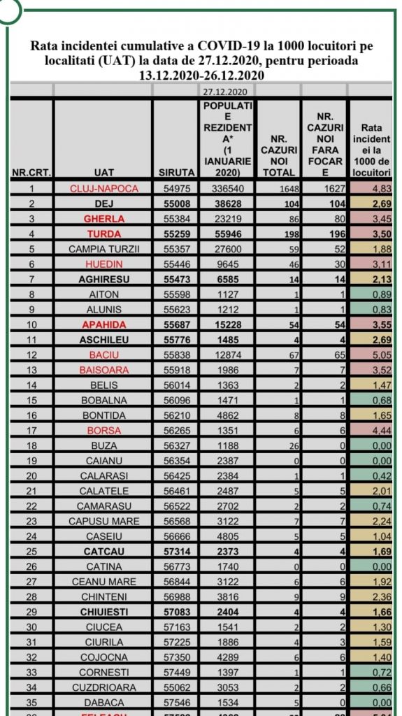 Potrivit hotărârii CJSU din această seară, Câmpia Turzii a trecut oficial în scenariul galben, la mică distanță de scenariul verde, cu o rată a incidenței de 1,88 la 1000 de locuitori.