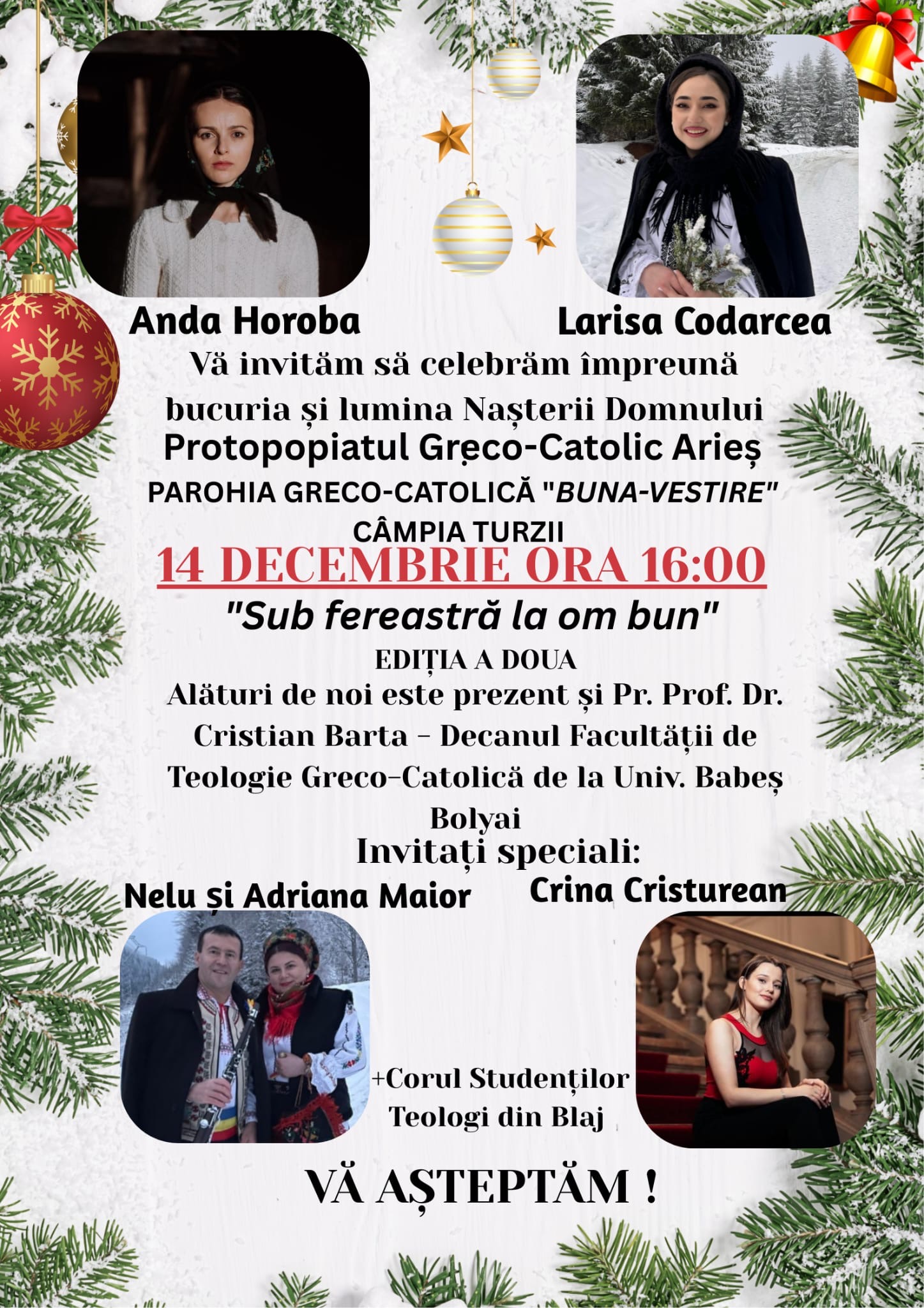 Parohia Greco-Catolică „Buna-Vestire” din Câmpia Turzii va găzdui sâmbătă, 14 decembrie, de la ora 16:00, cea de-a doua ediție a evenimentului cultural-religios „Sub fereastră la om bun”, organizat de Protopopiatul Greco-Catolic Arieș. Manifestarea își propune să aducă în sufletele credincioșilor bucuria și lumina Nașterii Domnului prin colinde tradiționale, obiceiuri și momente artistice.