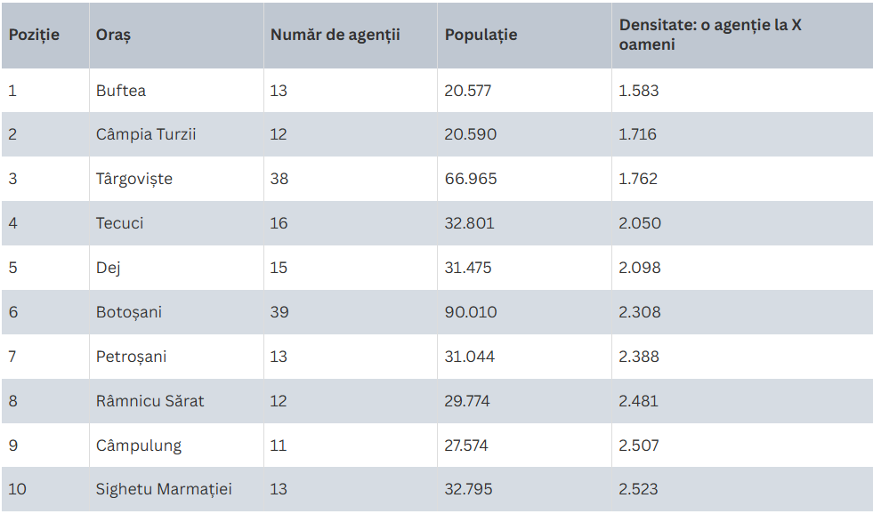 Un fenomen demn de luat în calcul este reprezentat de prezența extrem de intensă a agențiilor (raportat la populație) în orașe mici din România. În Predeal, de exemplu, există câte o agenție la doar 804 locuitori, urmat de Aninoasa (1.123 locuitori per agenție) și Mihăilești (1.293 locuitori per agenție). Conform datelor la nivel național, locuitorii acestor orașe mici au, practic, acces mai ușor la jocuri de noroc decât cei din Capitală sau alte centre urbane majore. Acest lucru nu este întâmplător. În zonele cu o viață socială mai puțin diversificată, operatorii de jocuri de noroc umplu acest gol, oferind divertisment și oportunități de socializare. La aceasta se poate adăuga și turismul sezonier, în cazul Predealului. Astfel, chiar și în micile comunități operatorii de jocuri de noroc se integrează fără probleme, acoperind nevoile membrilor de distracție diversă.