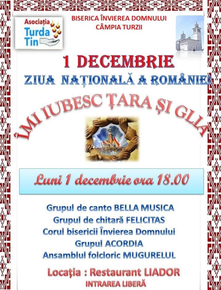 Cu ocazia Zilei Naționale a României, Biserica „Învierea Domnului” din Câmpia Turzii, în parteneriat cu Asociația Turda Tin, organizează un eveniment special dedicat unității și iubirii de țară. Manifestarea, desfășurată sub genericul „Îmi iubesc țara și glia”, va avea loc luni, 1 decembrie, începând cu ora 18.00, la Restaurantul Liador, iar accesul publicului este liber.