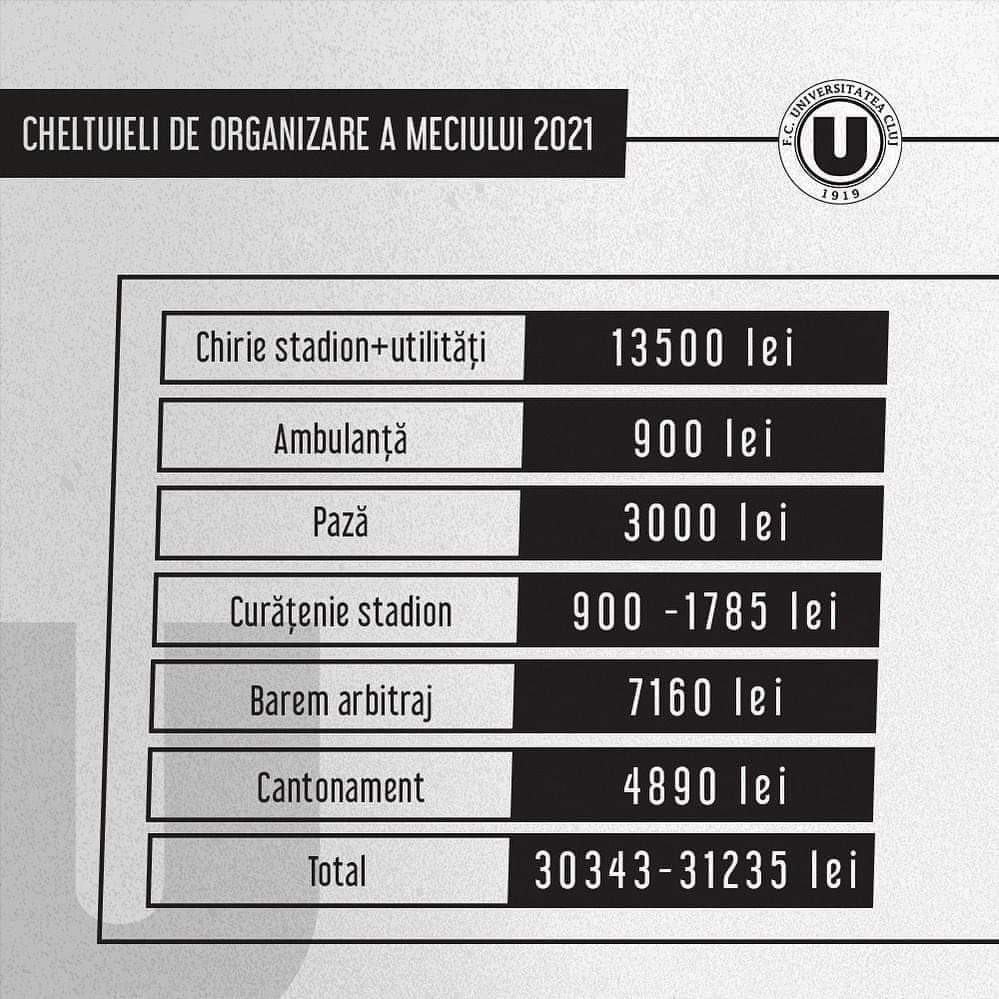 Recent, pagina oficială de facebook a echipei Universitatea Cluj a oferit detalii despre ceea ce înseamnă organizarea unui meci de fotbal pe super arena din Cluj Napoca. Pe principiul #transparență înainte de toate, se poate vedea suma de bani pe care echipa fanion a Clujului trebuie să o plătească în vederea desfășurării unui meci de liga a 2.