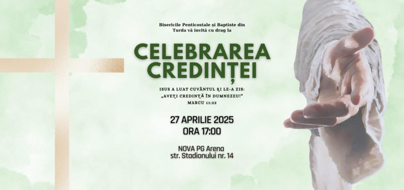De aceea, te invităm să fii alături de noi la un eveniment în premieră, intitulat Celebrarea Credinței. Acesta va avea loc în data de 27 Aprilie 2025, ora 17:00, la NOVA PG Arena.