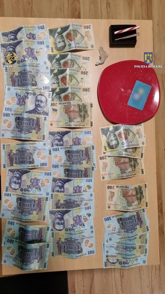 De asemenea, au fost ridicate o bancnotă de 1 leu răsucită, un grinder în care se aflau urme de substanță vegetală de culoare verde-oliv, un recipient metalic în care se afla o țigară confecționată artizanal și substanță vegetală sub formă de muguri (aproximativ 1 gram), 1 farfurie pe care se afla substanță pulverulentă, albă (aproximativ 1 gram) și un card de porționat, o folie de plastic în care se afla substanță pulverulentă, albă (aproximativ 0,5 grame), un telefon mobil și 4.000 de lei.