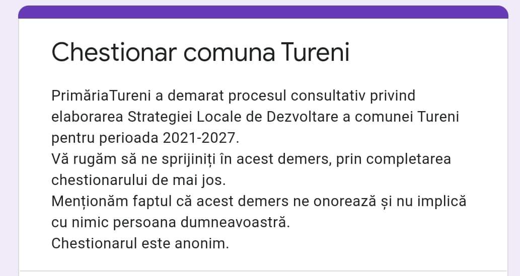 Cetățenii comunei Tureni sunt rugați să completeze un chestionar, cu privire la comuna din care fac parte.