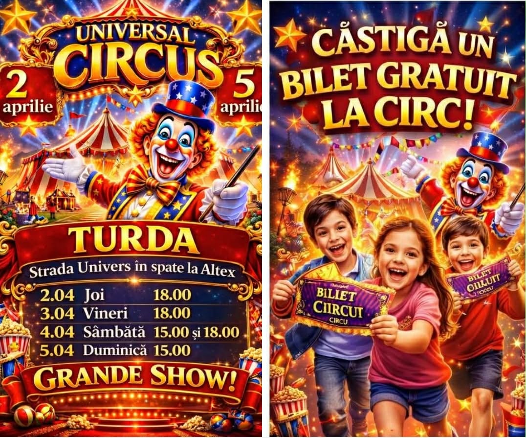 🎪 Universal Circus promite un spectacol memorabil, plin de culoare, emoție și energie, dedicat întregii familii. Turdenii sunt așteptați să intre, pentru câteva ore, într-o lume magică unde distracția este garantată!