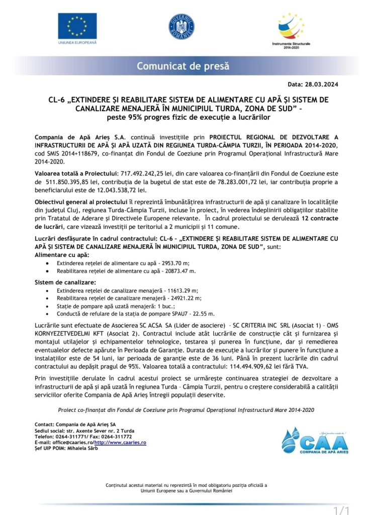 APĂ ȘI SISTEM DE CANALIZARE MENAJERĂ ÎN MUNICIPIUL TURDA, ZONA DE SUD”, sunt: