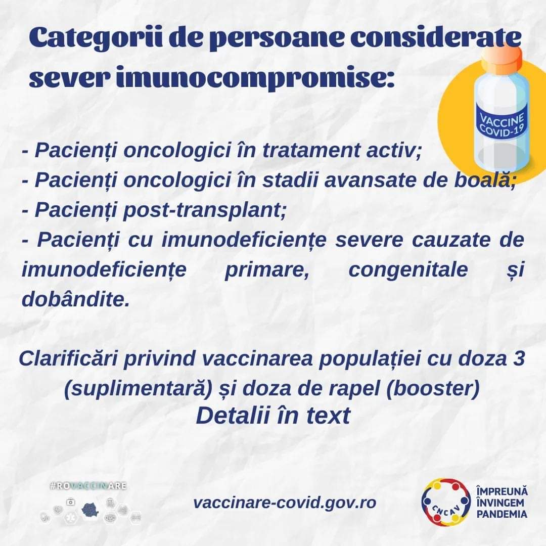 Mai multe informații pe: https://vaccinare-covid.gov.ro/clarificari-privind-vaccinarea-populatiei-cu-doza-3-suplimentara-si-doza-de-rapel-booster/.