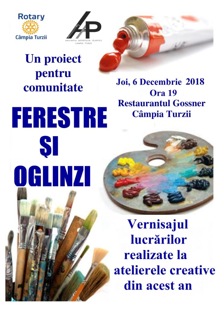 Clubul Rotary Câmpia Turzii în parteneriat cu Asociaţia Artiştilor Plastici Câmpia Turzii au derulat începând cu luna februarie a acestui an proiectul FERESTRE ŞI OGLINZI. Desfăşurate de 2 ori pe lună, atelierele creative au avut loc la Restaurantul Gossner, organizatorii punând la dispoziţia participanţilor materialele necesare, asigurându-le o îndrumare în domeniu, la ele putând participa în mod gratuit orice cetățean iubitor de artă. Scopul proiectului a fost de a crea un grup de iubitori artă format din membrii ai comunităţii din Câmpia Turzii care doresc să se exprime şi să comunice nonformal, să “evadeze”din cotidian și să se simtă bine împreună.