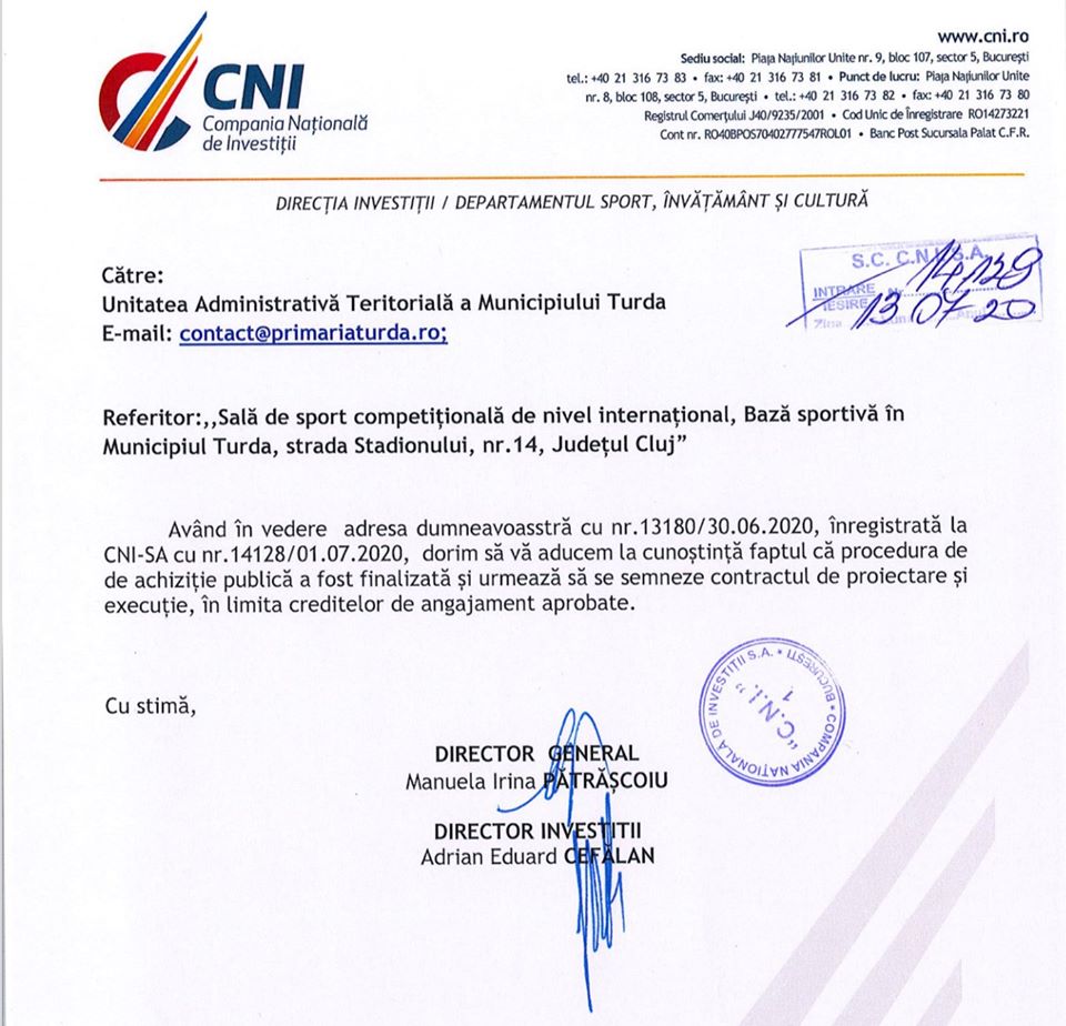 „Vești bune pentru Turda! Compania Națională de Investiții a finalizat procedura de licitație pentru construirea Sălii Polivalente! Va fi în curând semnat contractul de proiectare și execuție, urmând apoi etapa de proiectare și ulterior demararea efectivă a lucrărilor”, a fost anunțul făcut de Cristian Matei, primarul municipiului Turda.