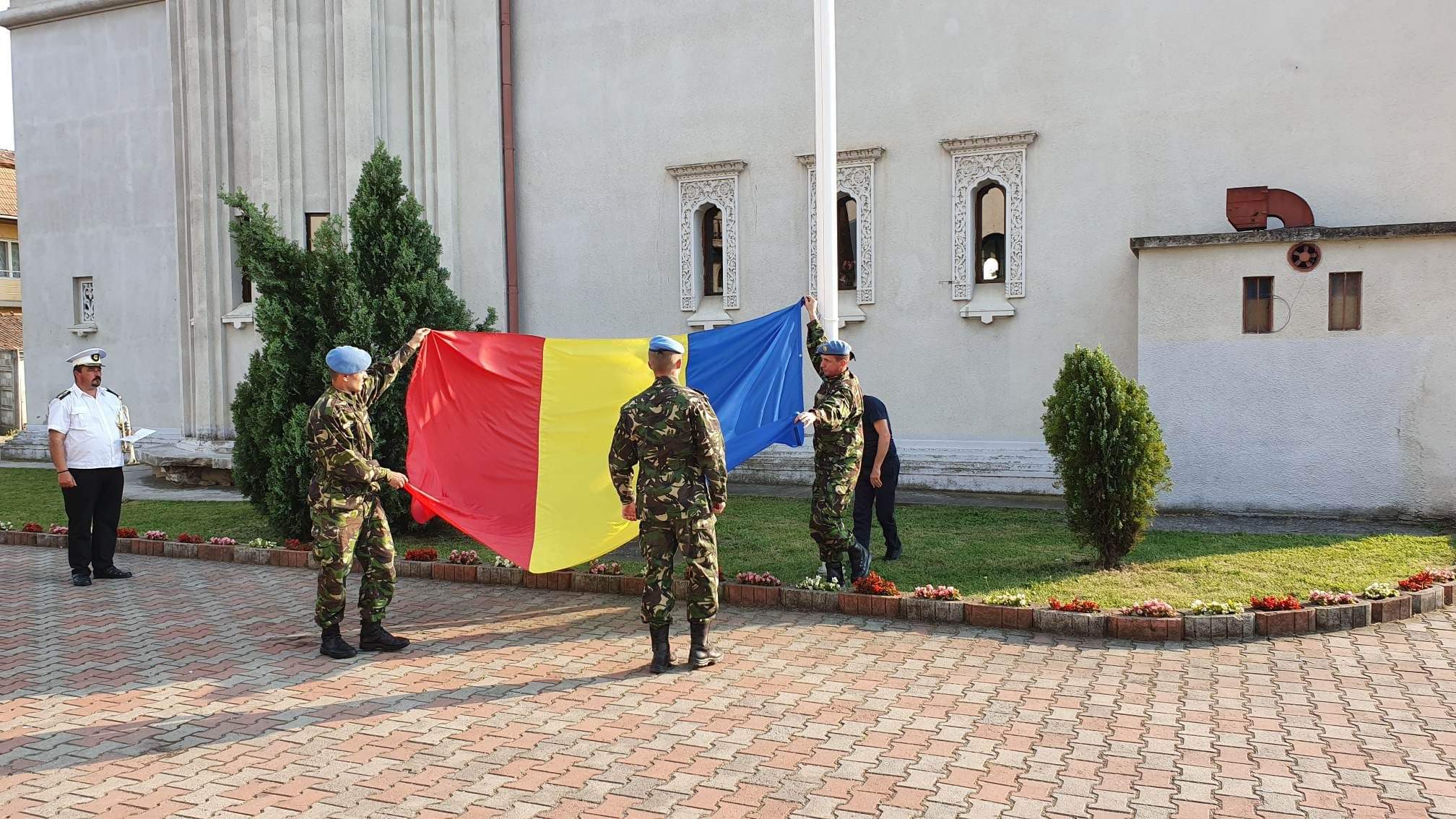 Ora 11:20 – 11:25 Scoaterea din biserică şi primirea drapelului României, care urmează a fi înălţat;