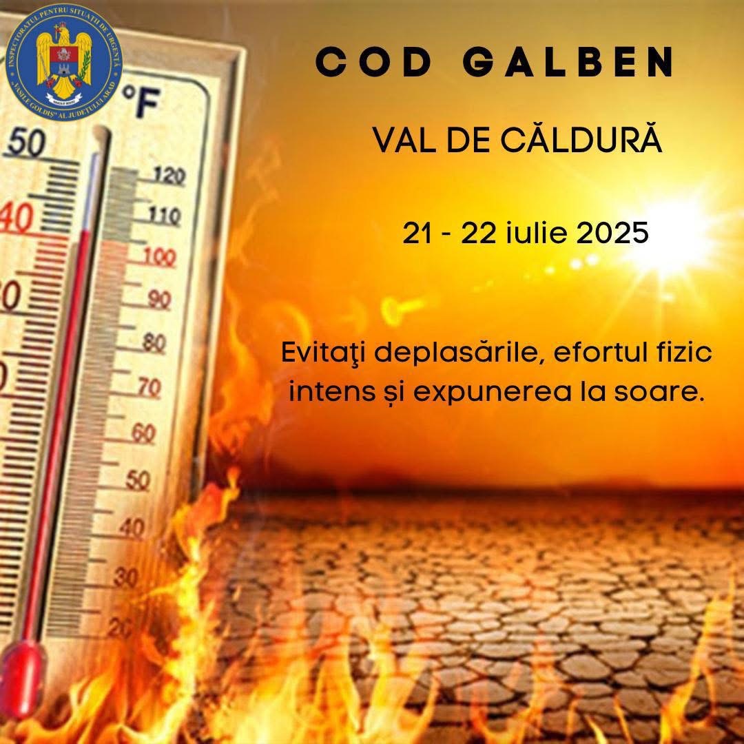 Administrația Națională de Meteorologie a emis COD GALBEN de caniculă, cu temperaturi deosebit de ridicate și disconfort termic accentuat, valabil în perioada 21 iulie 2025 ora 10:00 – 22 iulie 2025 ora 10:00, pe raza județului Arad.