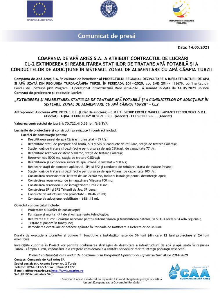 ȘI APĂ UZATĂ DIN REGIUNEA TURDA-CÂMPIA TURZII, ÎN PERIOADA 2014-2020, cod SMIS 2014+ 118679, co-finanțat din
