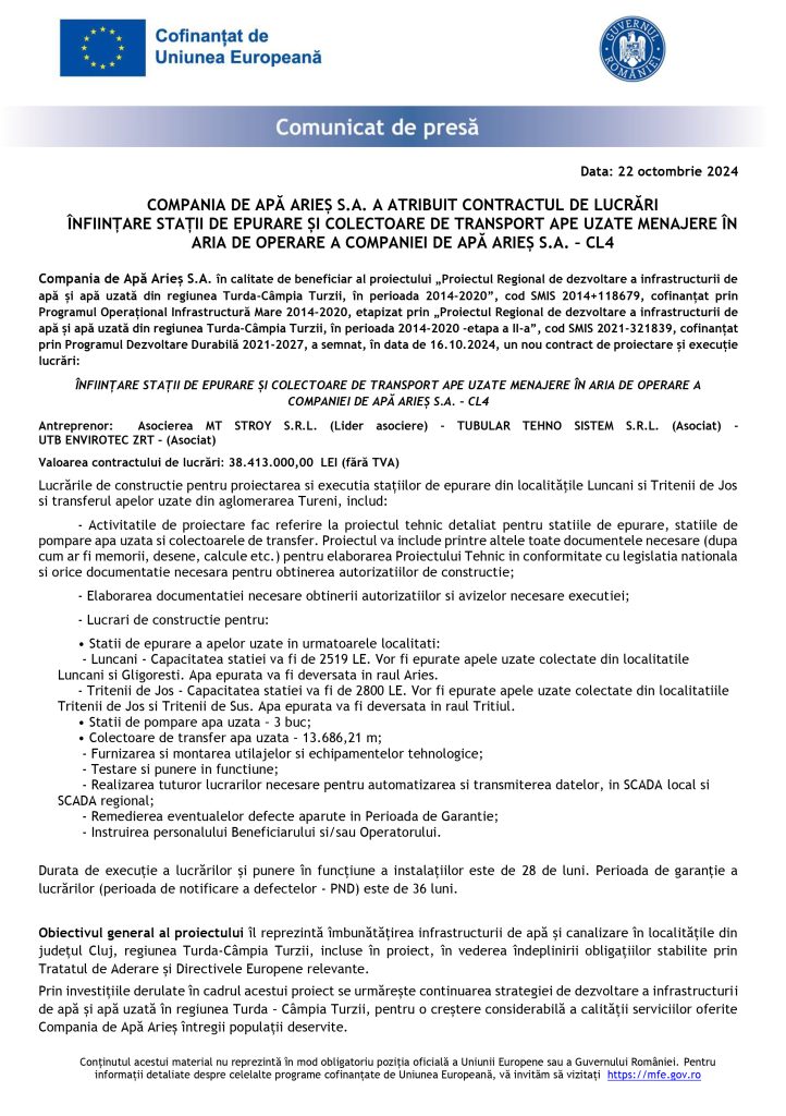 COMPANIA DE APĂ ARIEȘ S.A. A ATRIBUIT CONTRACTUL DE LUCRĂRI ÎNFIINȚARE STAȚII DE EPURARE ȘI COLECTOARE DE TRANSPORT APE UZATE MENAJERE ÎN ARIA DE OPERARE A COMPANIEI DE APĂ ARIEȘ S.A. – CL4