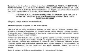 Contractul are ca obiect achiziționarea serviciilor de audit financiar (respectiv, auditarea tuturor activităților proiectului, a înregistrărilor și a conturilor acestuia, conform legislației în vigoare și cerințelor finanțatorului) pentru Proiectul Regional de dezvoltare a infrastructurii de apă și apă uzată din regiunea Turda-Câmpia Turzii, în perioada 2014-2020.